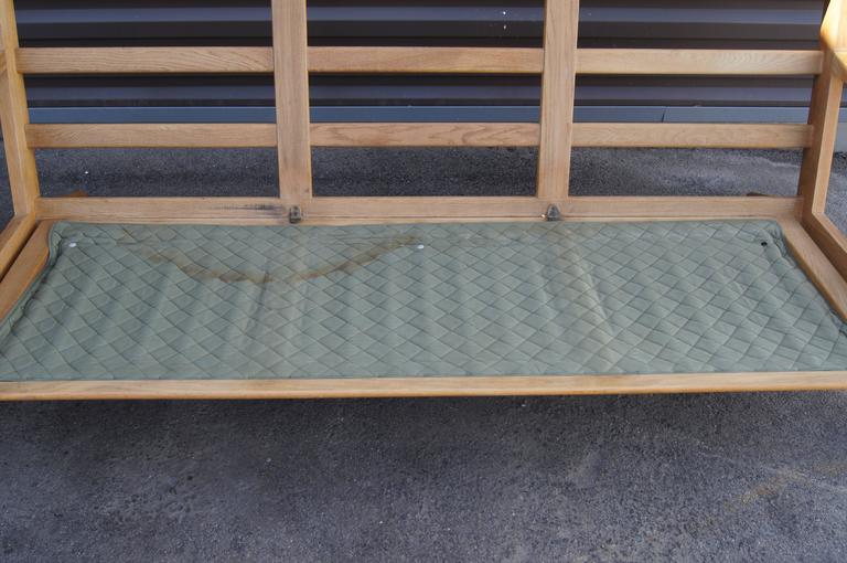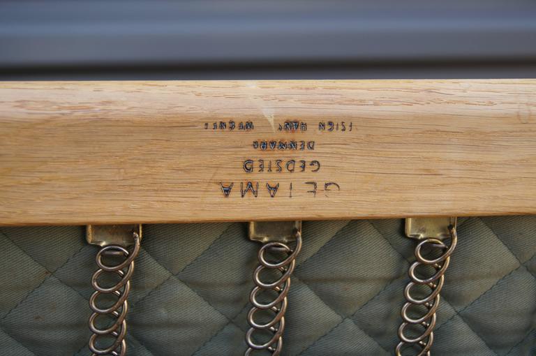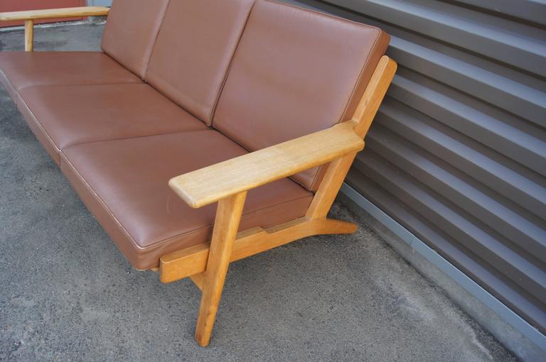 Designed by Hans J. Wegner in 1953 for GETAMA, this sofa, model GE 290, is one of his most iconic designs. The solid oak frame features distinctive paddle armrests and a lattice back. The original spring cushions are covered in a warm brown leather with a beautiful patina. A corresponding pair of high-back lounge chairs is also available.