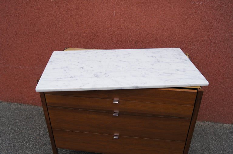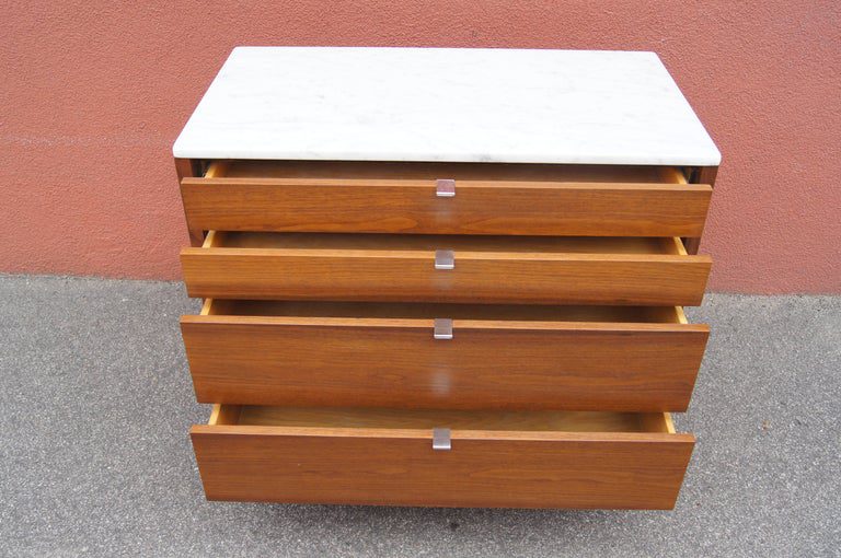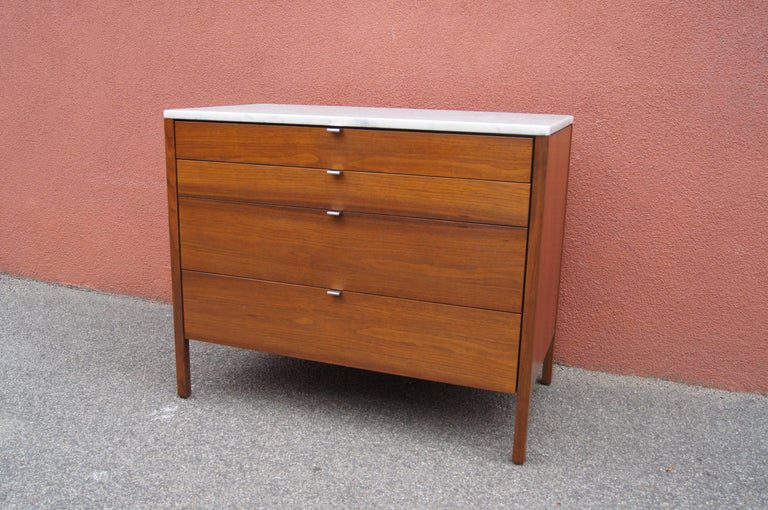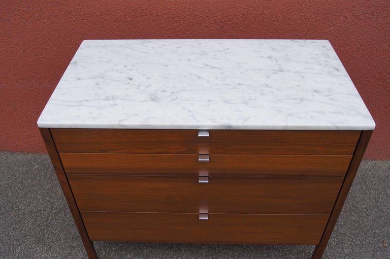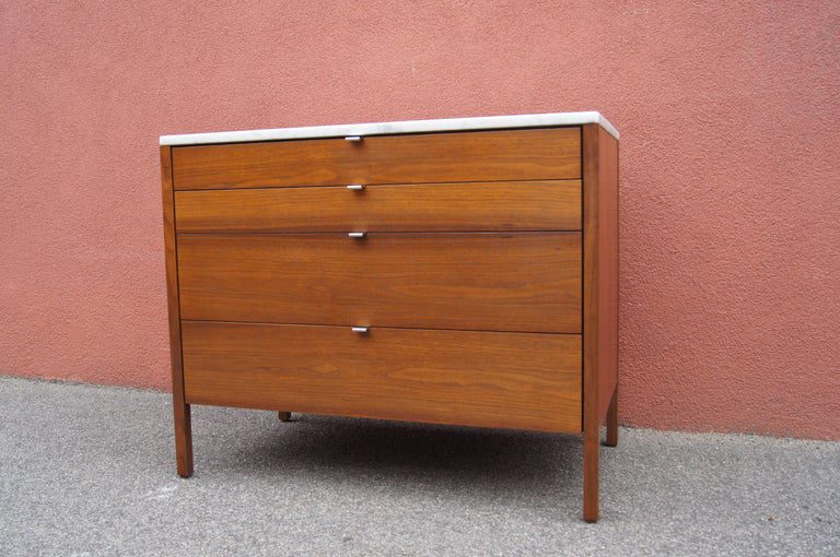 United States, 1960s Designed in 1960 by Florence Knoll, this four-drawer dresser, model 325, has a clean-lined walnut case. This version features the luxury options of a marble top and chrome pulls.