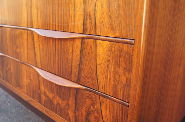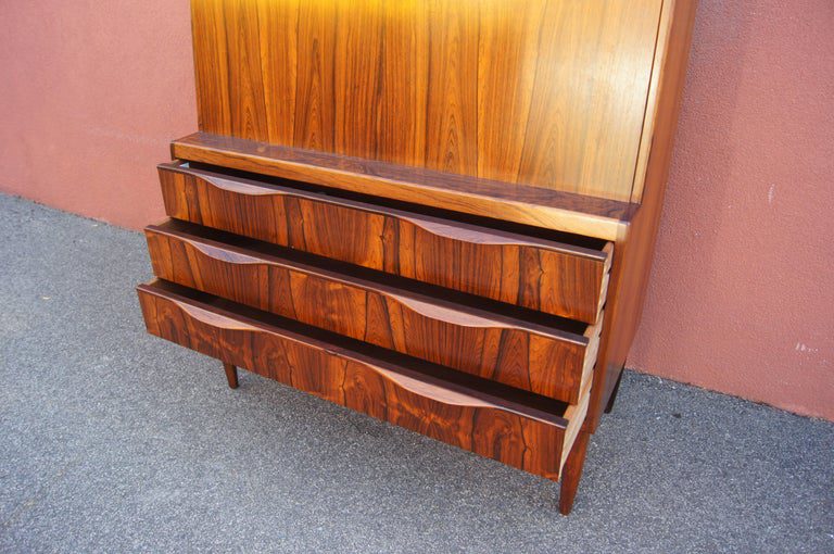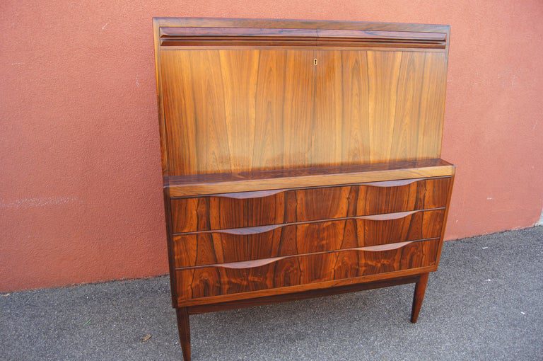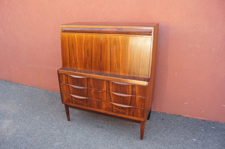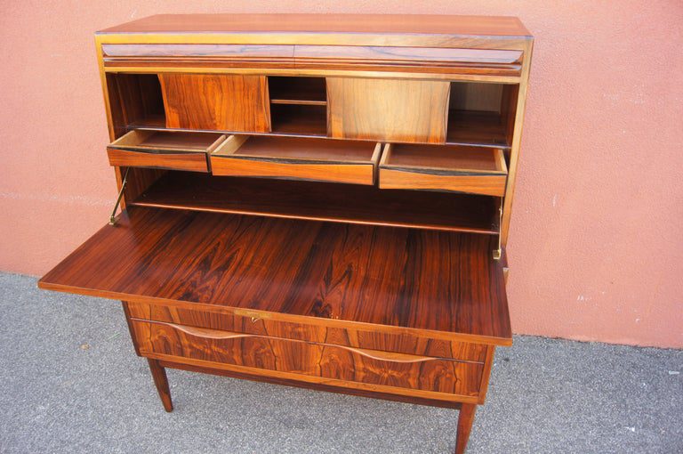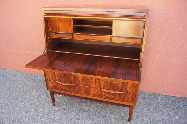 Designed by Ib Kofod-Larsen, this Danish modern secretary desk has been crafted from rosewood with beautifully matched grains. The locking desktop folds down, revealing a wide shelf, three drawers with bowtie fronts, and three small cubby spaces behind sliding doors. Two shallow drawers concealed at the top release by pressing a hidden button. Below three large drawers feature eye-catching sculpted pulls. The entire case sits lightly on well-proportioned legs.