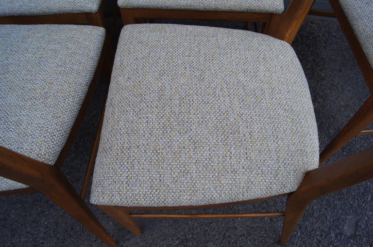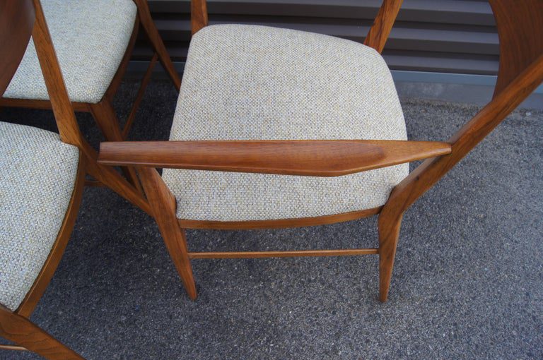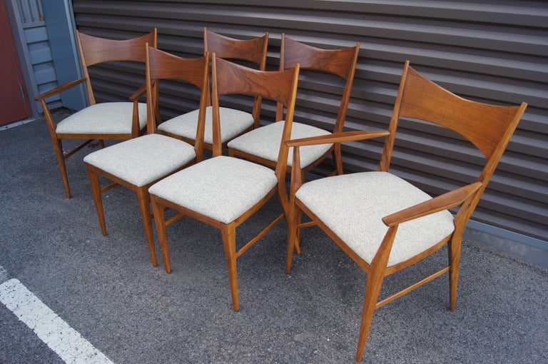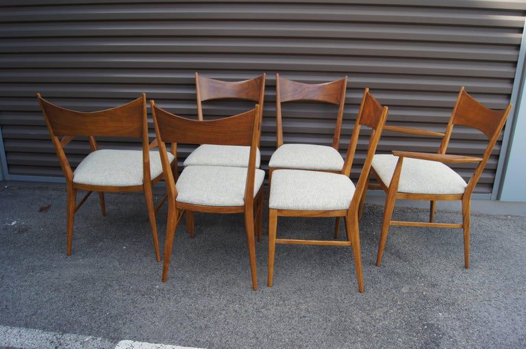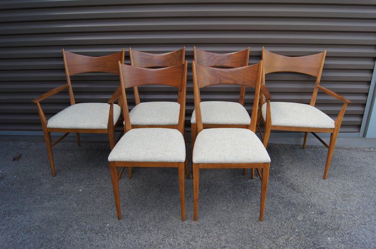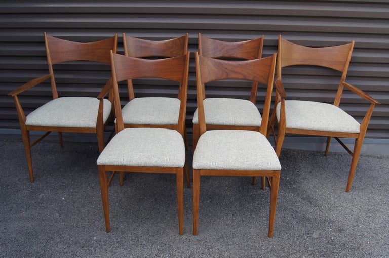 Paul McCobb designed this set of six sculptural walnut chairs as part of his Irwin Group collection for Calvin Furniture. Their bowtie backs are as comfortable as they are elegant. The set includes four side chairs and two armchairs. Measurements below are for the armchairs. The side chairs are 17" W x 20.5" D x 35" H