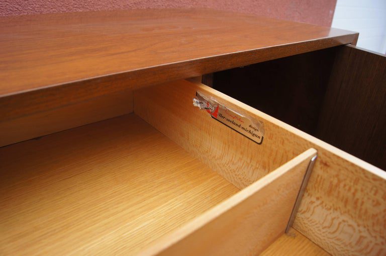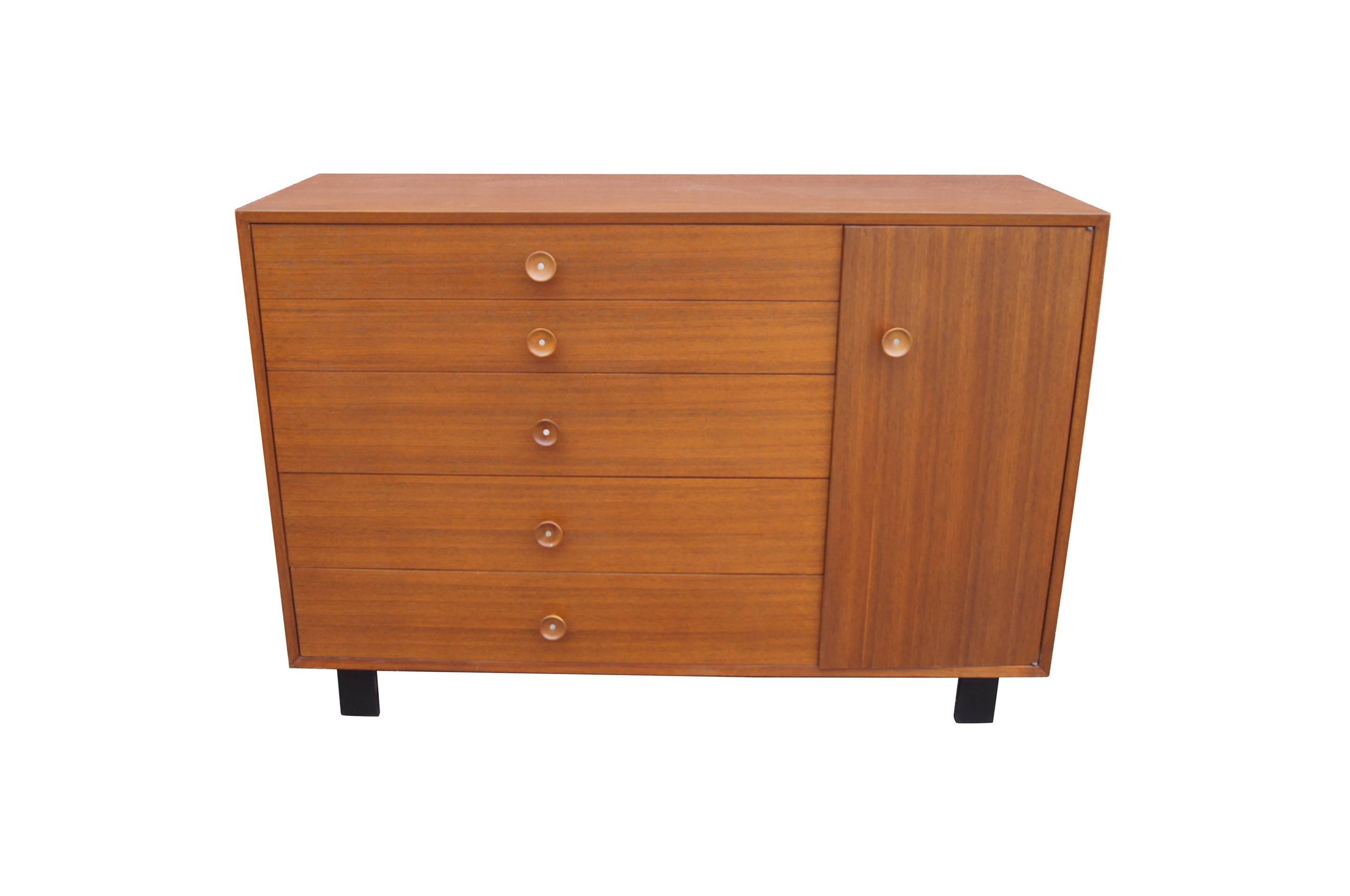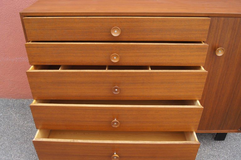 George Nelson designed this handsome dresser or cabinet, model 4935, for Herman Miller's Basic cabinet series. The tawny walnut case comprises five drawers on the left with dividers in the first and third drawers and a cabinet on the right with two shelves. It sits on ebonized block feet. Both the drawers and cabinet door feature expressive round walnut pulls with satin chrome inserts.